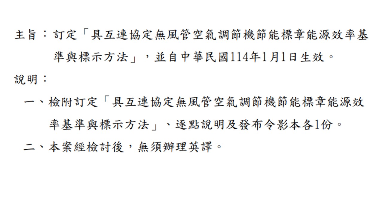 能源局正式公告具互連協定冷氣機節能標章基準,條文如附件供參。
